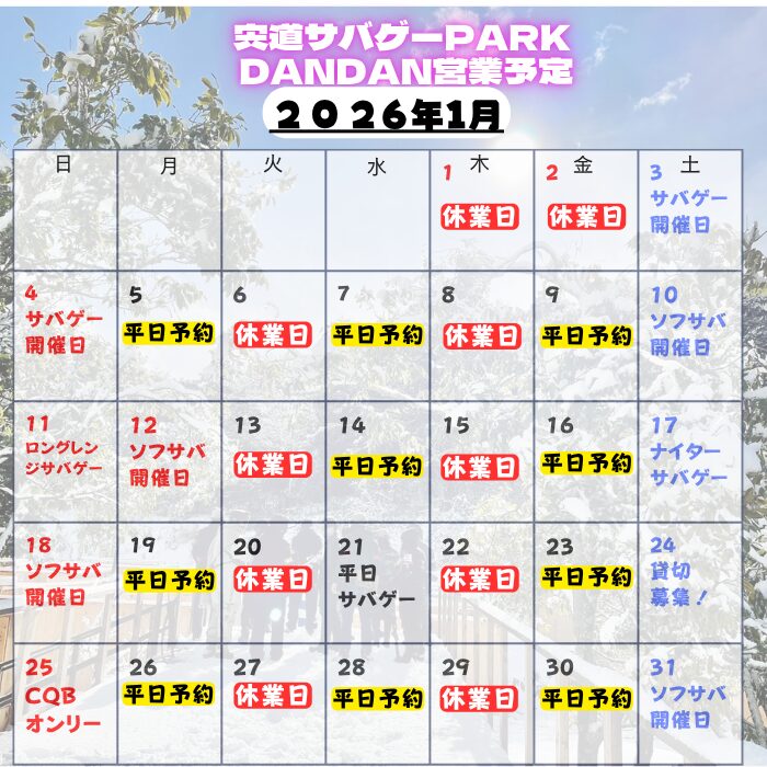 11/22(土)CQBオンリー開催日、11/23(日)みらチャレイベント開催日、11/24(月祝)ソフサバ開催日、11/26(水)平日CQBオンリー開催日、11/29(土)ナイターサバゲー開催日、11/30(日)ソフサバ開催日 ず~~っとソフサバ参加費2,000円!営業カレンダー11月(タップで予約画面へ)営業カレンダー12月(タップで予約画面へ)営業カレンダー1月(タップで予約画面へ)貸切問い合わせフォーム公式アカウントまとめ宍道サバゲーPARK DANDANとは 2022年4月、松江市宍道町に西日本最大級の サバイバルゲームフィールドが誕生! 松江市×地域振興団体×地元企業 奇跡のタイミングで揃った3者がまちおこしの ために公園を利活用する社会実験中! 松江市出身サバゲー歴20年超えのオーナー、タカが作成した広大な森とCQBの複合フィールド。 サバゲーマーも、これからサバゲーを始める人も楽しめるサバゲーフィールドです! Tweets by dandan_KK_CLIP Follow @dandan_KK_CLIP あ!現金忘れた!…大丈夫です。DANDANはキャッシュレス決済に対応メディアさん取り上げ、外部紹介リンクなど 新聞社さんやテレビ局さんからの取り上げ実績です!ご紹介くださっている外部リンクなどもこちらからご覧いただけます。 下記バナーからDANDANご予約できます!